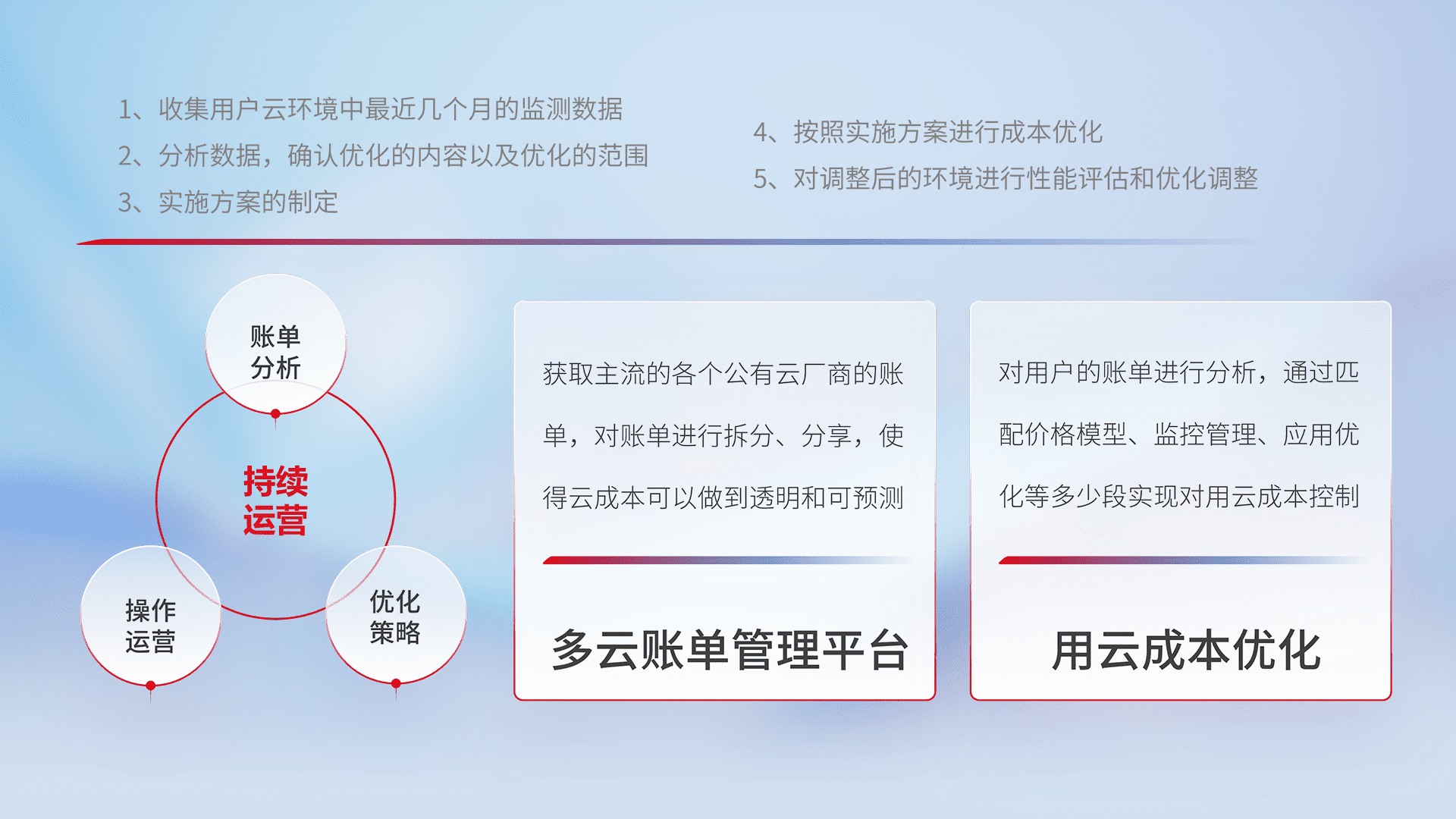 通过多云纳管,,,以统一的资源数据模型把客户的云资源进行抽象和封装,,,,进而实现对多云资源的统一操作,,保障云资源管理的可靠性、、稳定性与可用性。。量身定制化运维内容,,,配置、、、开发运维、、补丁管理、、、、备份、、监控、、认证和访问管理、、、审计和日常巡检等,,,保障在用云过程中的可靠度,,,,稳定度以及高可用率。。